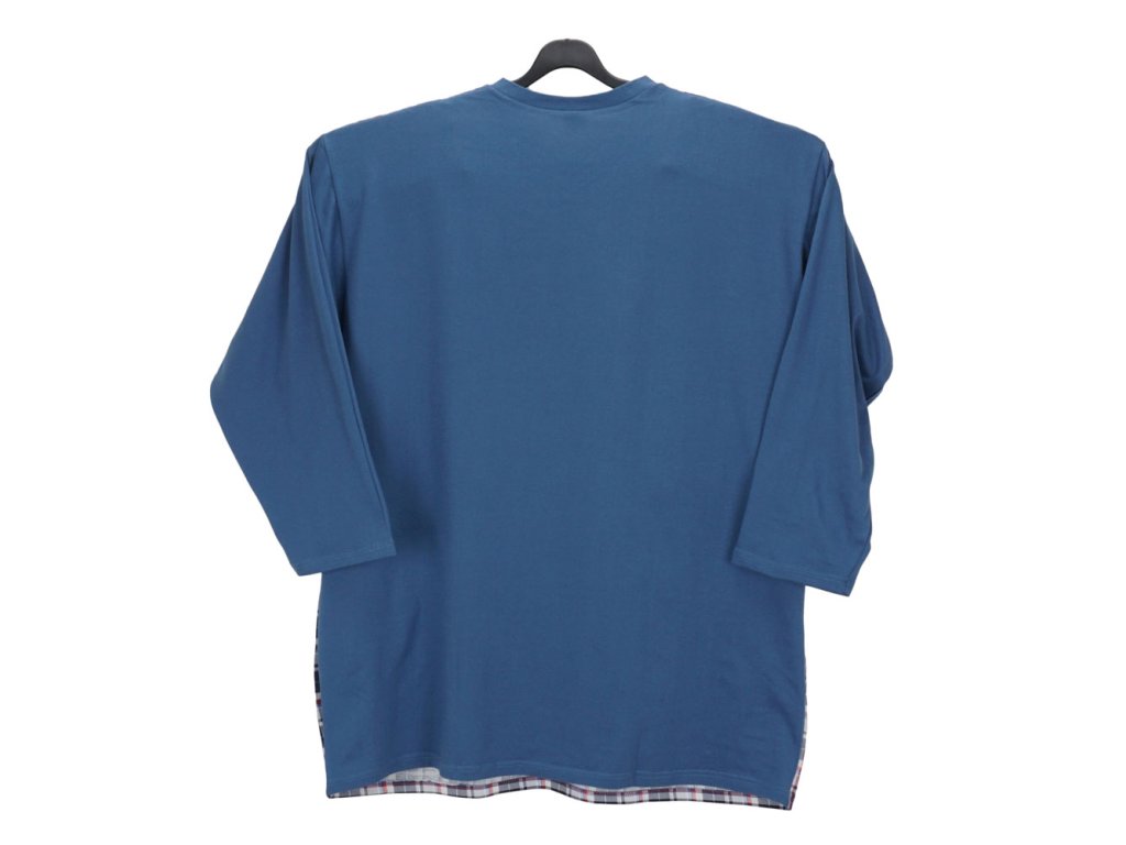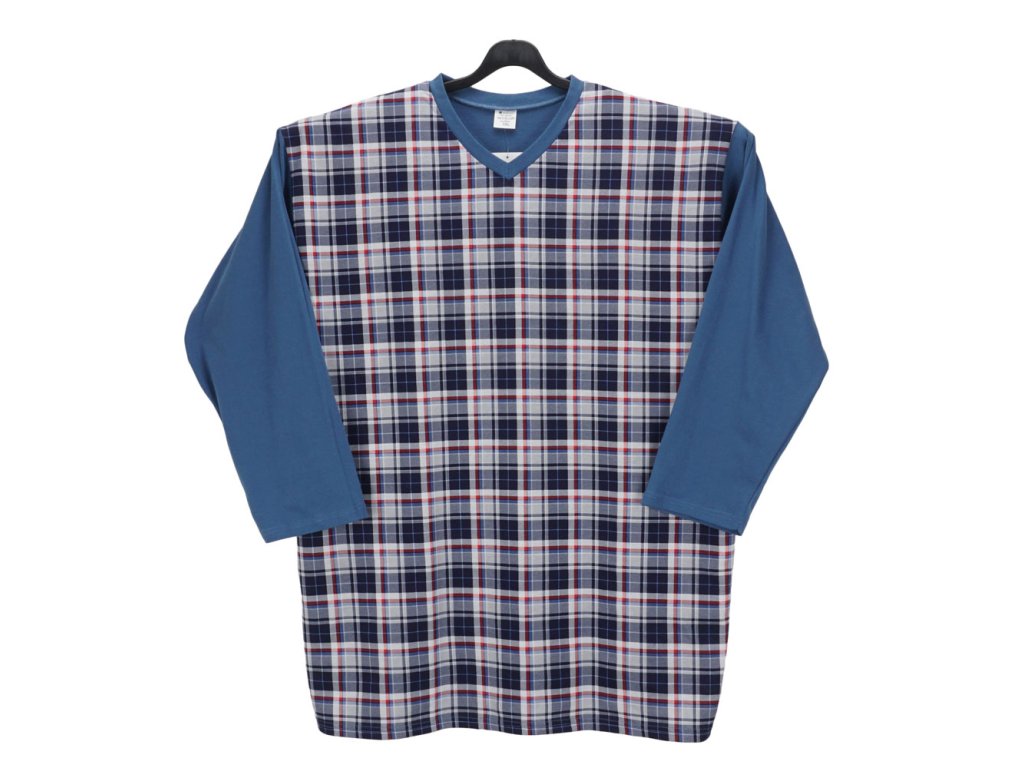 Pyžamo pánské s dlouhými rukávy a nohavicemi světle modré. Přední díl je zdobený károvaným vzorem, výstřih V. Kathoty mají pohodlný patent u kotníku, guma v pase není prošitá, lze ji upravit nebo vyměnit.